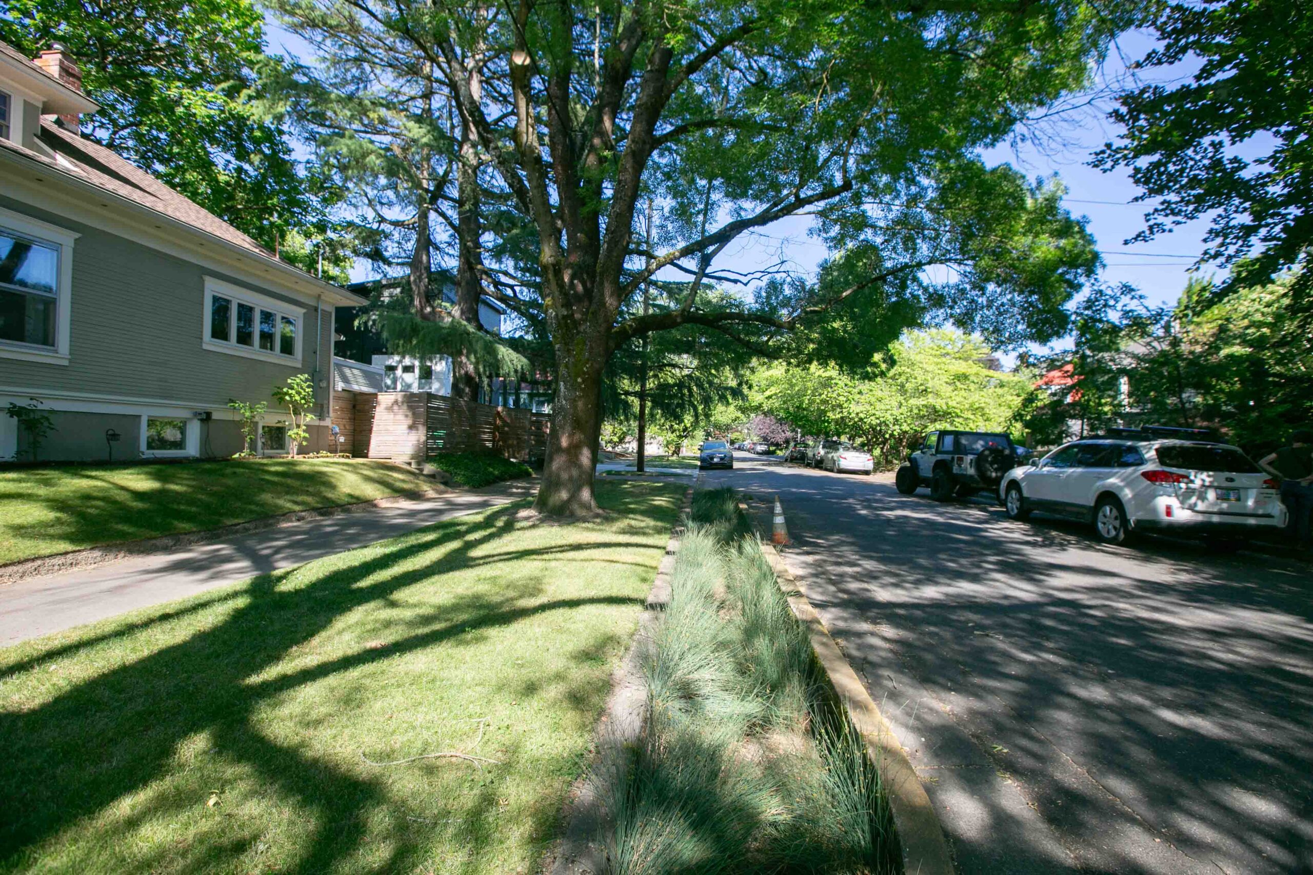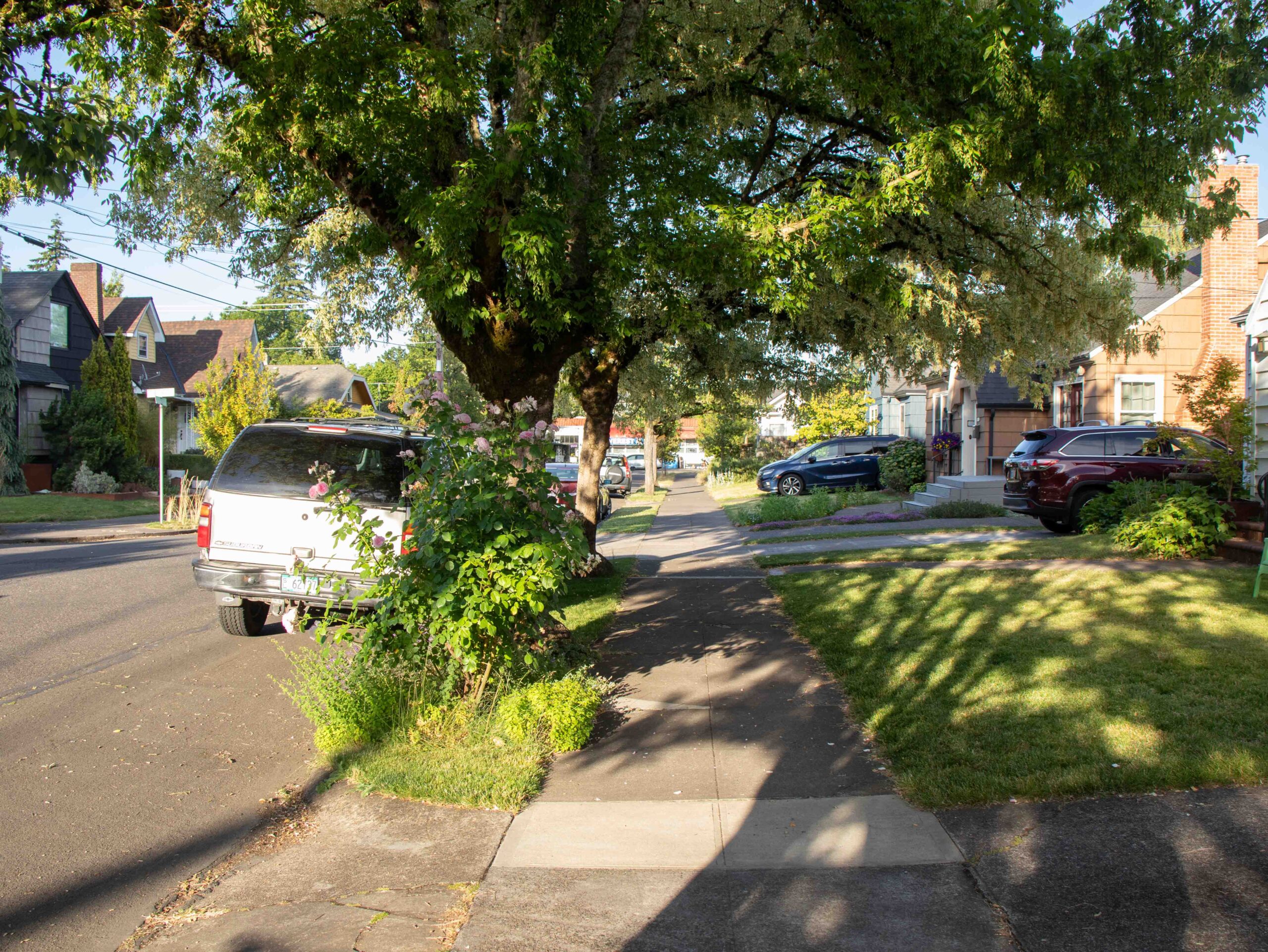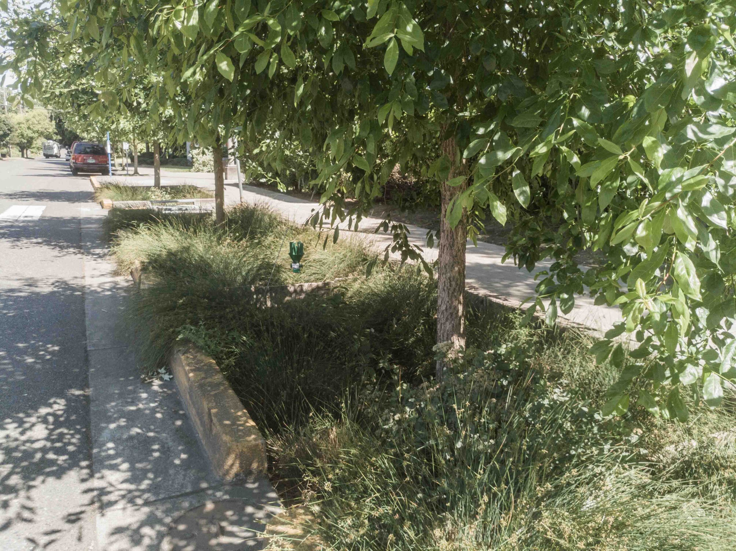 Avant d’arriver à Portland, nous avions lu différentes documentations sur le projet. A ce stade il était difficile de différencier ce qui était de la communication de ce qui était réellement fait sur le terrain. Nous avons posé nos valises lors d’une soirée de juin et ce n’est que le lendemain matin que nous avons découvert notre environnement proche. Nous pensions alors devoir nous renseigner sur la localisation de ces ouvrages. Quelle surprise quand nous avons découvert que notre rue entière était une rue verte, puis la rue suivante, et ainsi de suite! Nous avons eu la sensation dans certains quartiers de traverser une mosaïque de jardins. Durant notre séjour la météo a été plutôt chaude et sèche, nous n’avons pas pu assister au fonctionnement des systèmes. En revanche nous avons pu tester l’effet de régulation de la température lors d’un épisode de forte chaleur: le thermomètre est monté plusieurs jours de suite jusqu’à 39°C. La présence des arbres et de la végétation accompagnant l’ensemble des structures des rues vertes a vraiment rempli son rôle de régulateur. On pouvait marcher dans les rues sans ressentir la chaleur accablante du soleil.