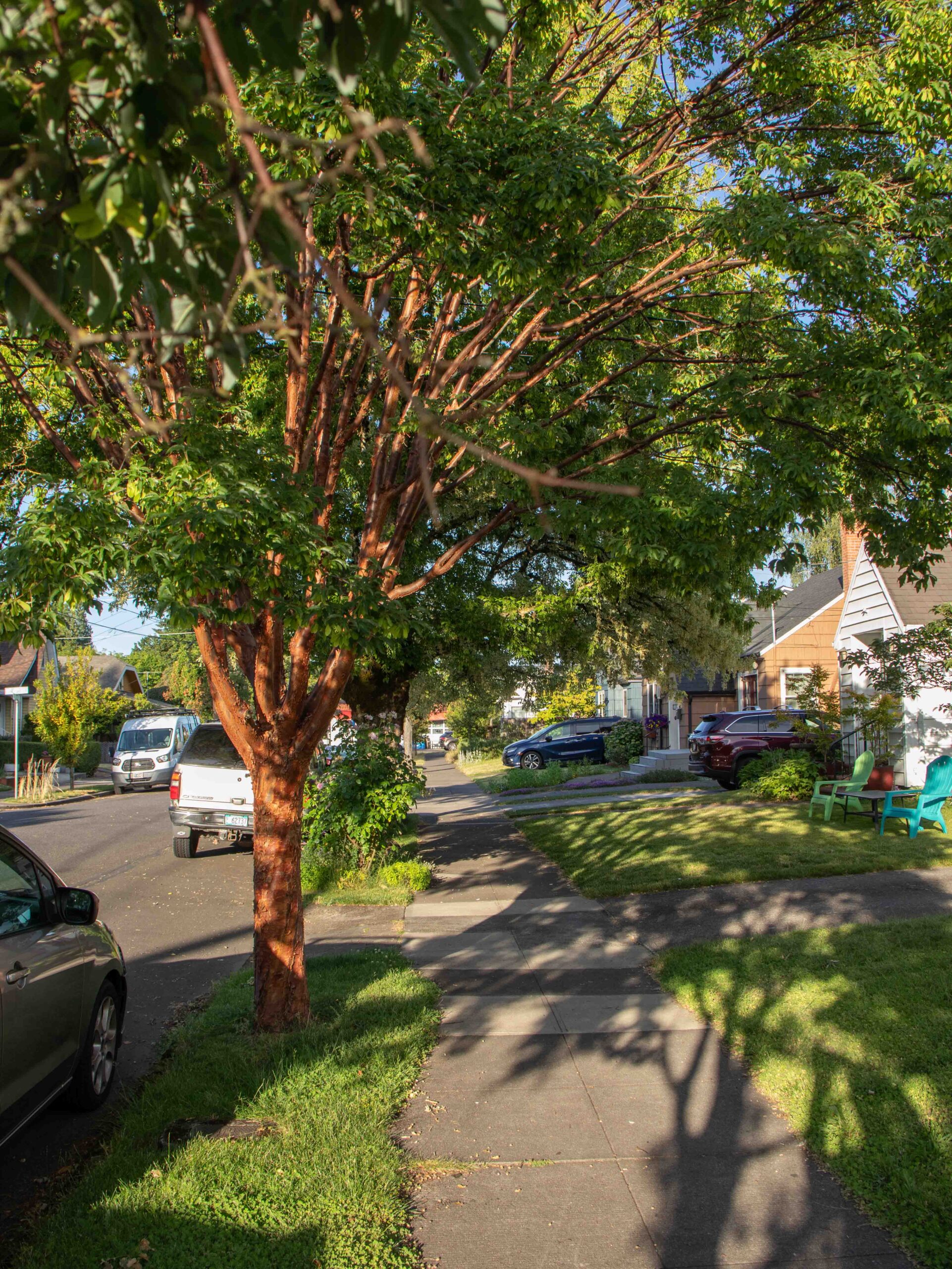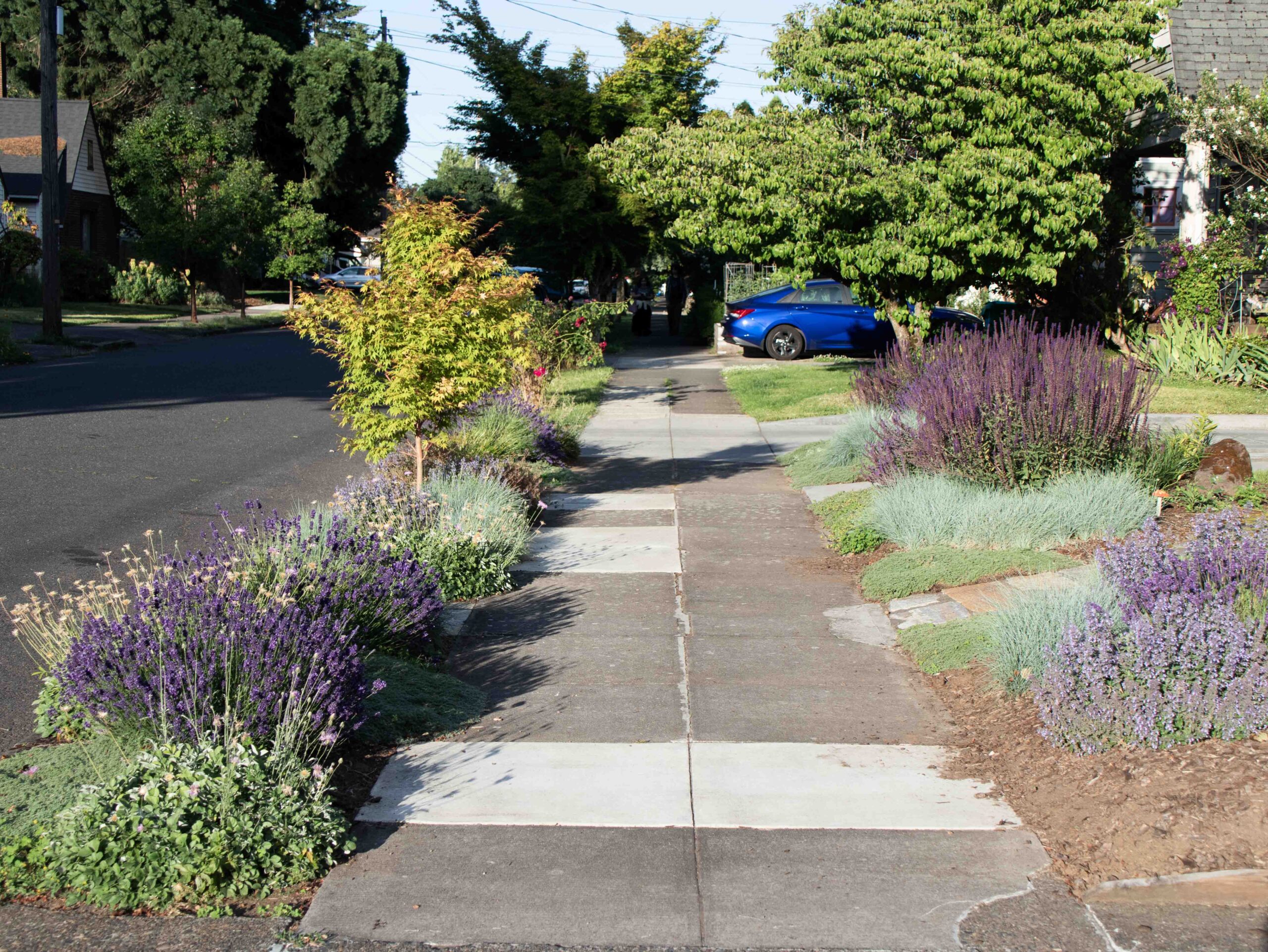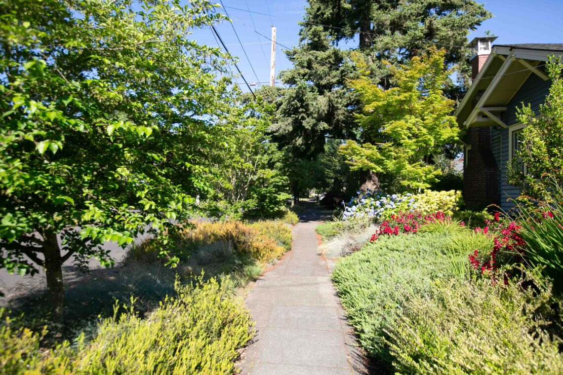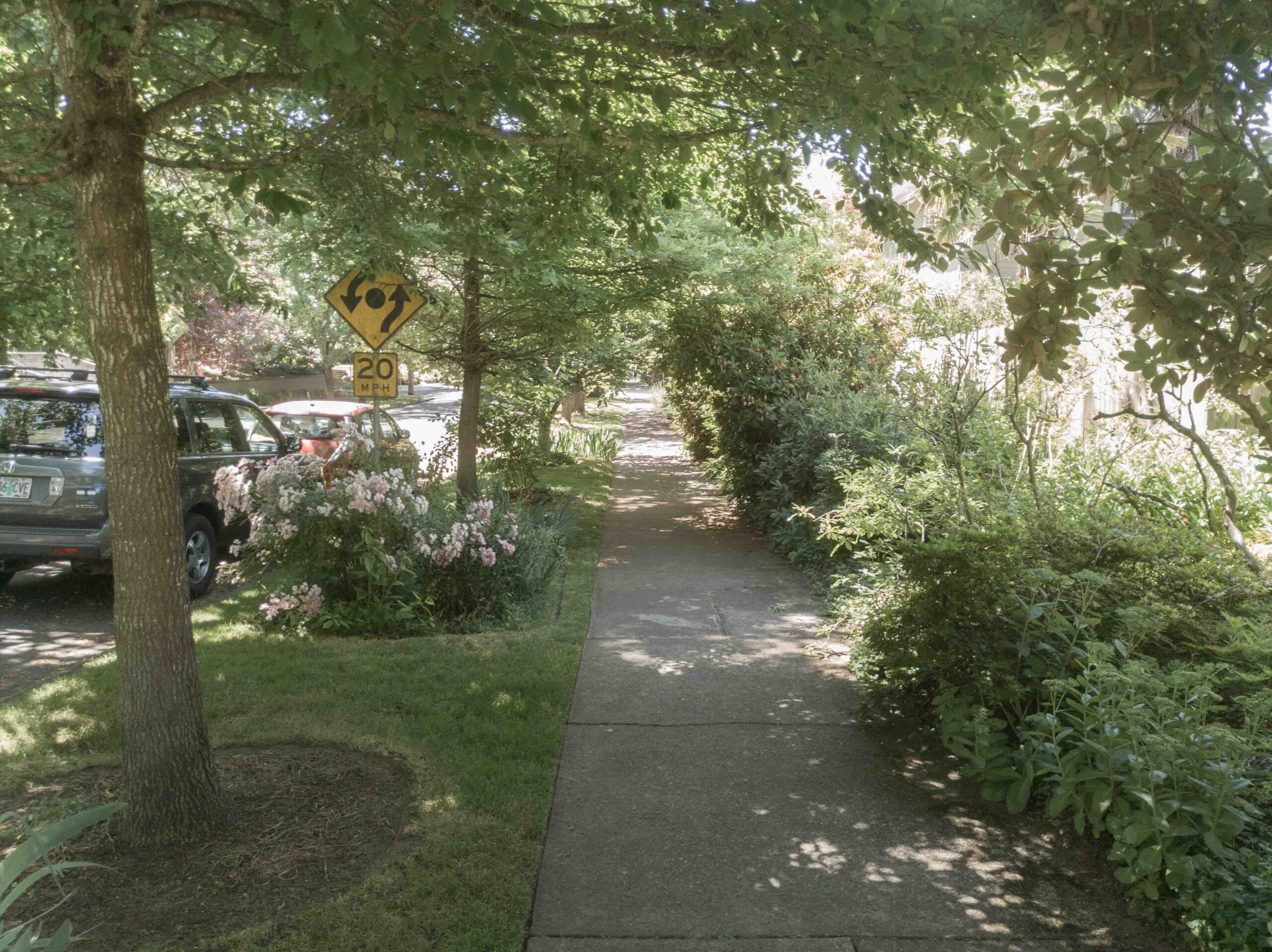 Avant d’arriver à Portland, nous avions lu différentes documentations sur le projet. A ce stade il était difficile de différencier ce qui était de la communication de ce qui était réellement fait sur le terrain. Nous avons posé nos valises lors d’une soirée de juin et ce n’est que le lendemain matin que nous avons découvert notre environnement proche. Nous pensions alors devoir nous renseigner sur la localisation de ces ouvrages. Quelle surprise quand nous avons découvert que notre rue entière était une rue verte, puis la rue suivante, et ainsi de suite! Nous avons eu la sensation dans certains quartiers de traverser une mosaïque de jardins. Durant notre séjour la météo a été plutôt chaude et sèche, nous n’avons pas pu assister au fonctionnement des systèmes. En revanche nous avons pu tester l’effet de régulation de la température lors d’un épisode de forte chaleur: le thermomètre est monté plusieurs jours de suite jusqu’à 39°C. La présence des arbres et de la végétation accompagnant l’ensemble des structures des rues vertes a vraiment rempli son rôle de régulateur. On pouvait marcher dans les rues sans ressentir la chaleur accablante du soleil.
